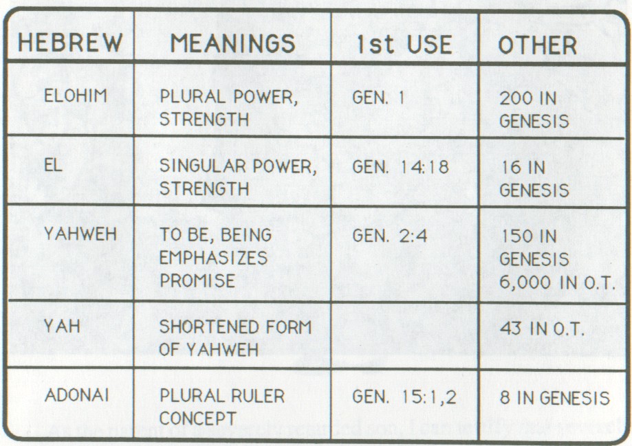 If we are not in God’s physical image, then what does the reference we saw at the beginning of the lesson refer to? The answer is found in the meaning of the word God in the Hebrew language. The chart below shows the words translated God in the Old Testament of the Bible and what their uses and meanings are. You will notice that the word Elohim is used exclusively in Genesis 1. This word conveys the power, strength, and majesty of God. It is also a plural word. By reading further, we find out what the reason is for this plural usage. Genesis 1:2 tells us that “the Spirit moved upon the face of the waters.” John 1:1; Colossians 1:13-19 and other passages tell us that Jesus was there at the beginning. In Matthew 28:19, we read, “Go ye therefore, baptizing them in the name of the Father and the Son and the Holy Spirit.” There are three separate entities to this thing that we call God, and yet one God. So, too, are there three separate entities to each of us—and yet each of us is a single being.